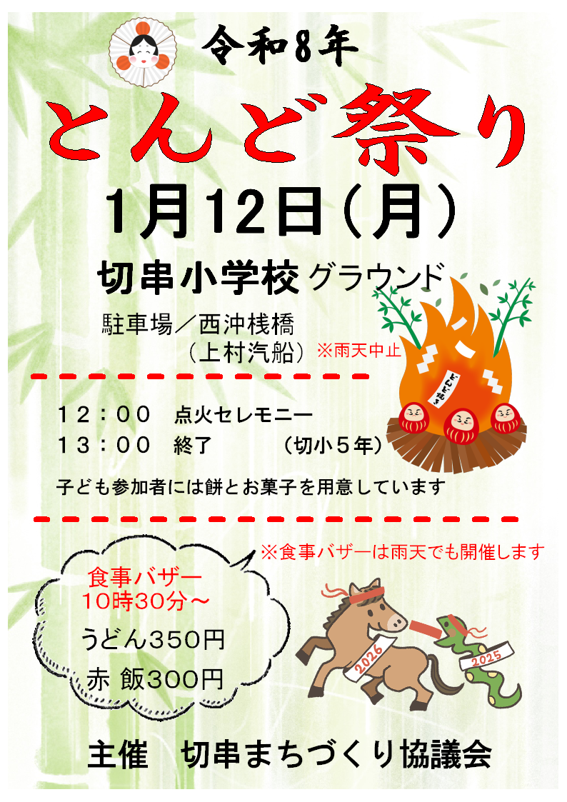| 江田島 | 切 串 | 1月12日(月・祝) | 12:00点火 | 切串小学校グラウンド | 切串チラシ |