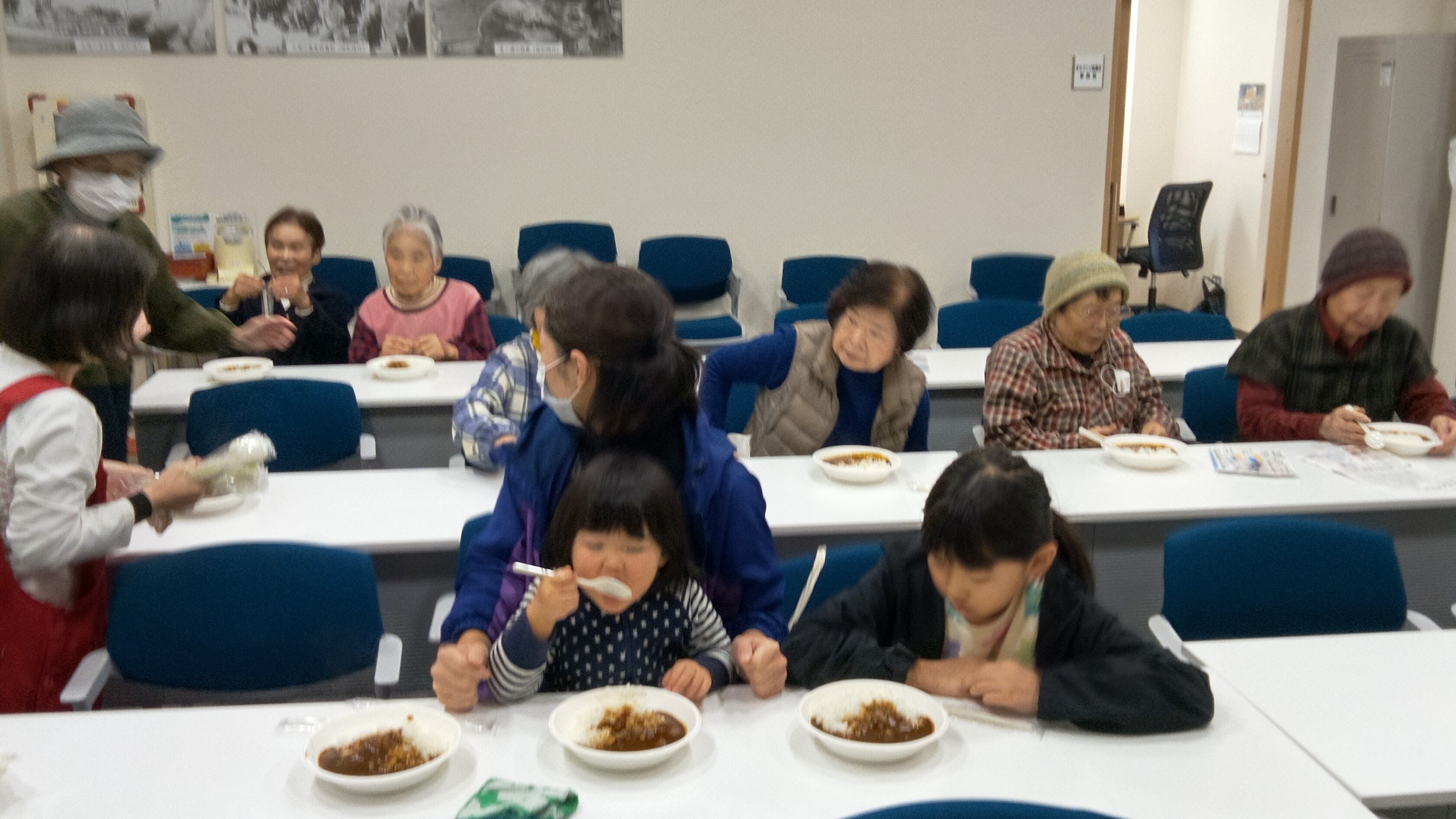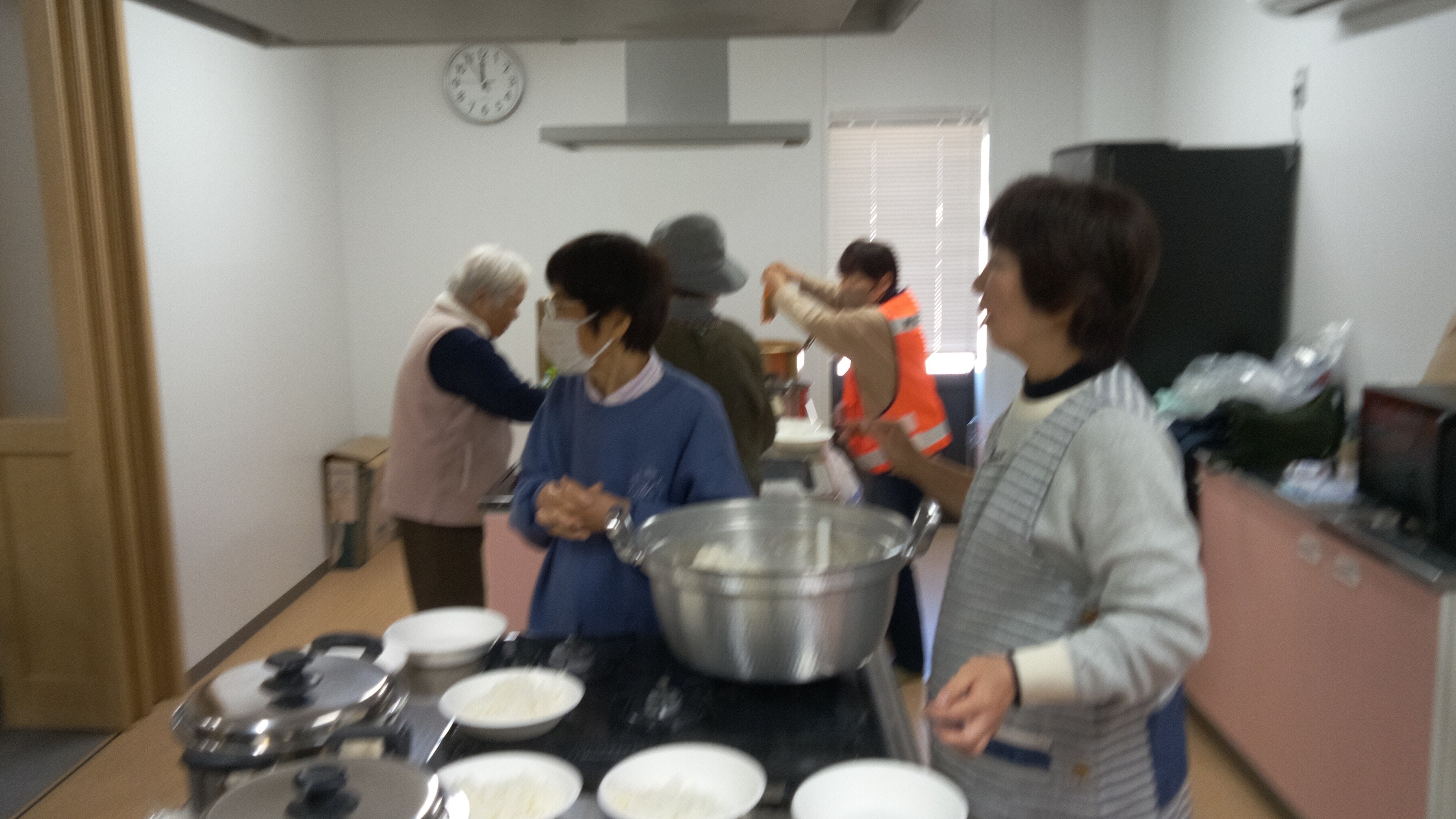 地域放送により避難訓練を実施し、地域防災を考える研修会を行った後、広域的大災害が発生し、地域が孤立した場合を想定した非常炊き出し訓練を行いました。