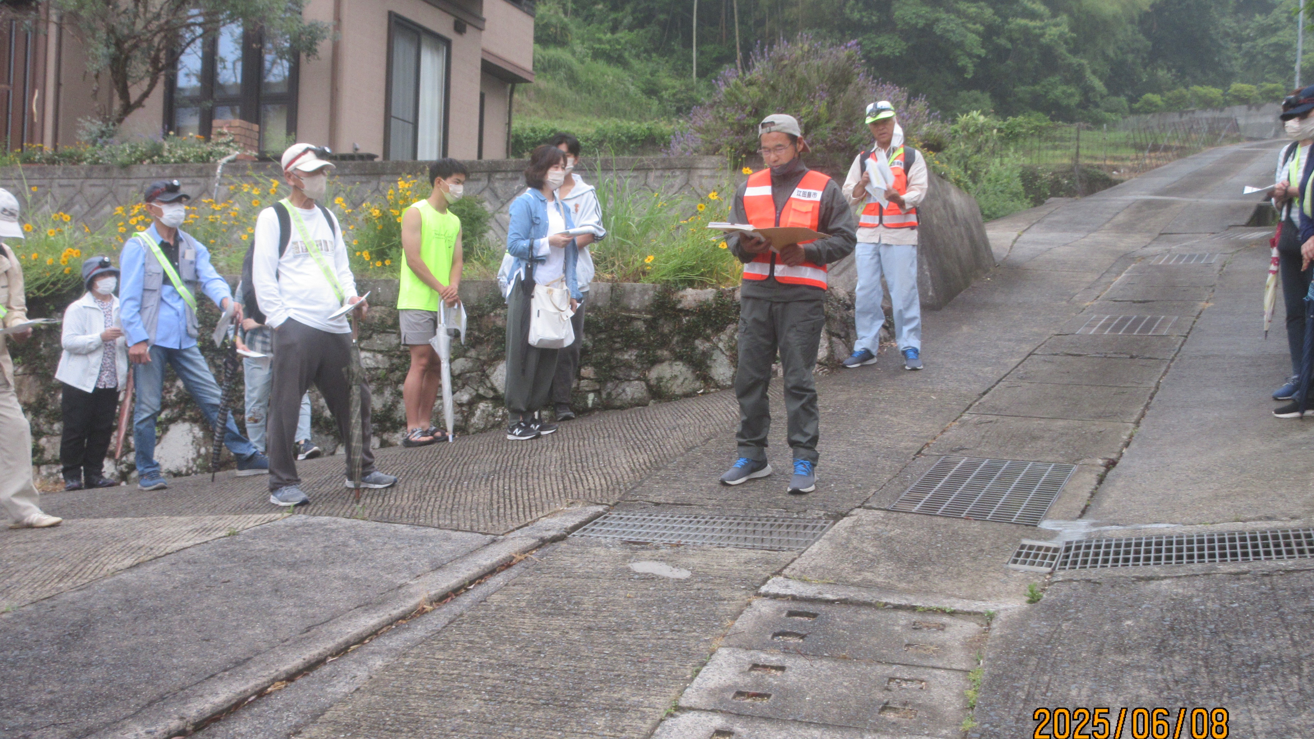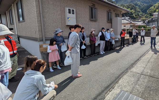 幸ノ浦自主防災会は、地域の一斉清掃実施後に、緊急時一時集合場所である荒神社境内に集合し、地域防災について研修会を開催しました。