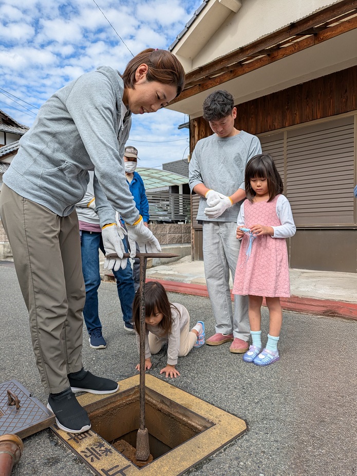 消火栓訓練では、地域のお子さんたちも含めて一緒に防災施設に触れ、地域防災について、共に体験し、学びました