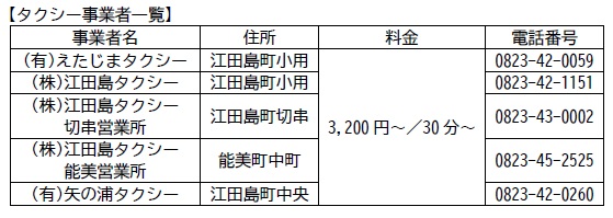 市内のタクシー事業者では、利用時間や人数に応じて乗車できる「観光向けタクシーサービス」を導入しています。