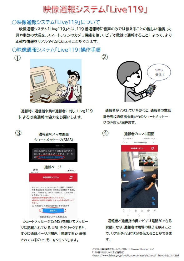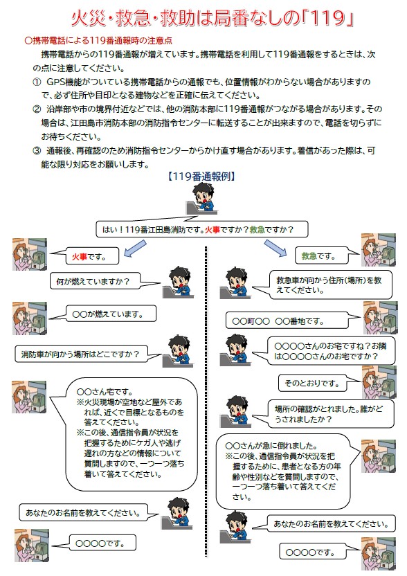 皆さんの正確な119番通報(リンク先:119番通報要領|江田島市役所ホームページ (city.etajima.hiroshima.jp))が、迅速、的確な消防活動につながります。