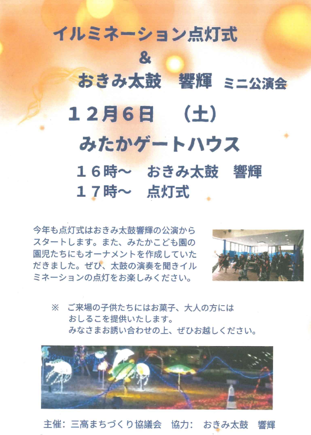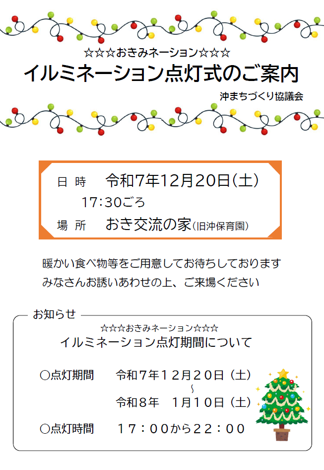 おき交流の家(沖美町畑1032-1) | 12月20日(土) 点灯式 17:30頃 【主催:沖まちづくり協議会】 |