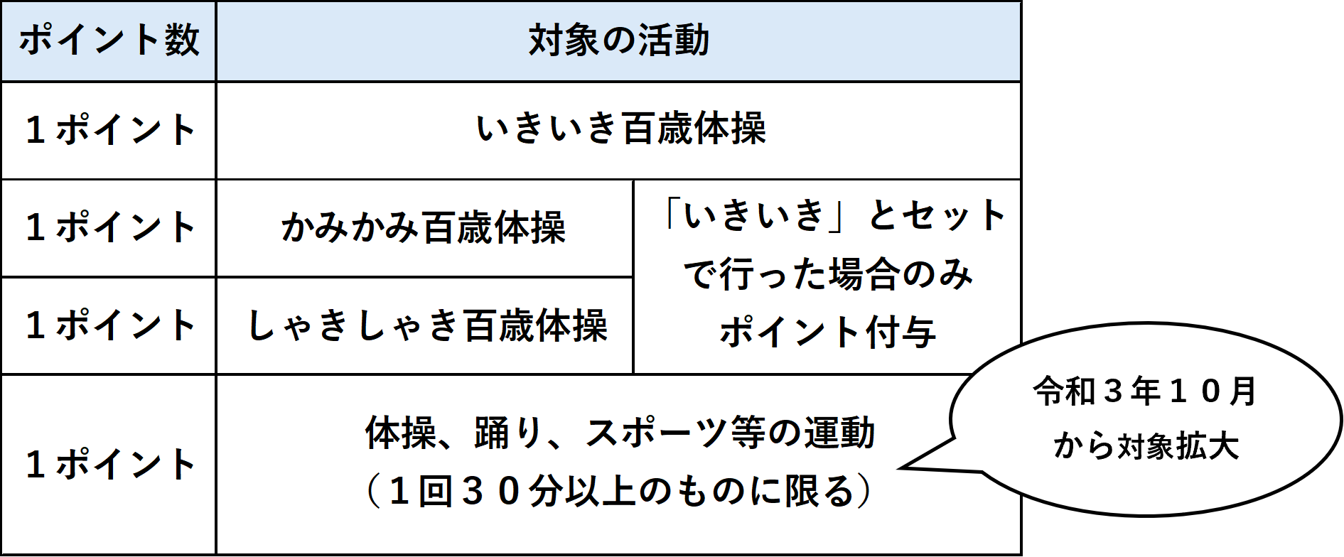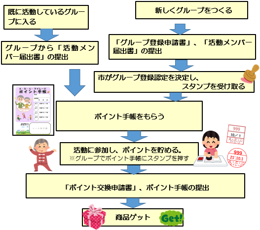 いきいき百歳体操などに取り組む活動グループを市に登録して、そのグループで百歳体操や健康増進活動を行うとポイントが付与されます。貯まったポイントは、ふるさと産品などの介護予防奨励品と交換できる事業です。