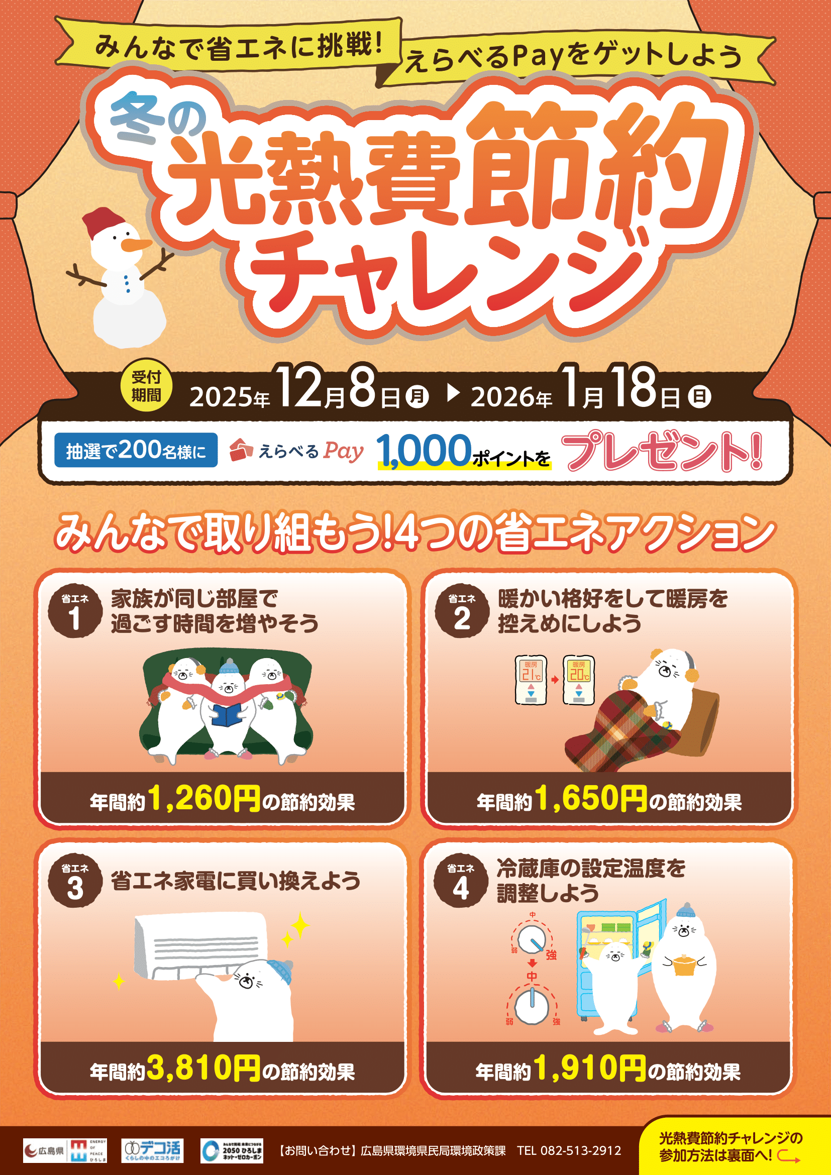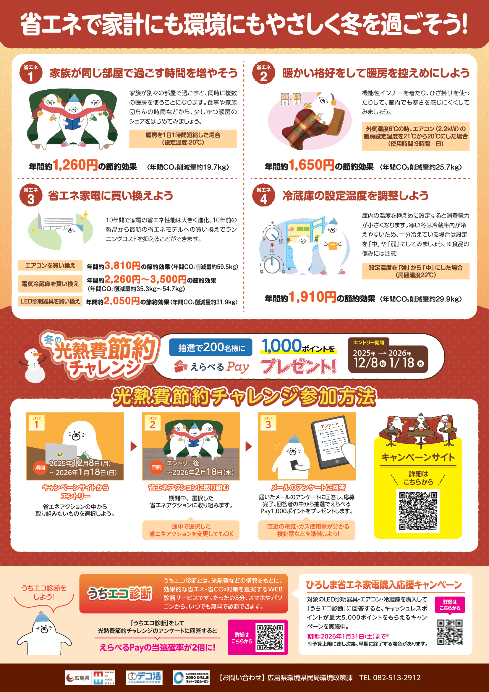 冬は暖房使用等により、一般的には1年間で最もエネルギー需要が増す季節です。そこで、広島県では、県民の皆様へ環境配慮行動(省エネ行動)の実践を呼びかけ、家庭における省エネの取組を促進する「冬の光熱費節約チャレンジ」を今年度も開催いたします。