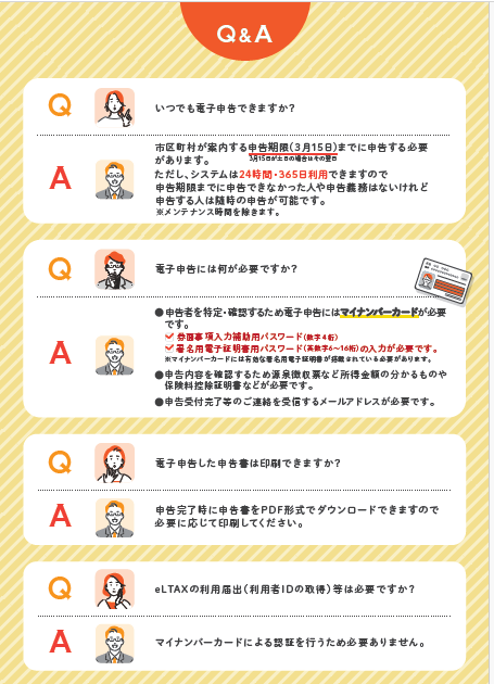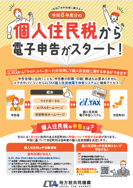 スマートフォンやパソコンからeLTAX(エルタックス)にアクセスし、「マイナンバーカード」を利用して、個人住民税に関する申告ができます。システムは24時間365日利用できますので、申告期限までに申告できなかった人、申告義務はないけれど申告する人は随時の申告が可能です。