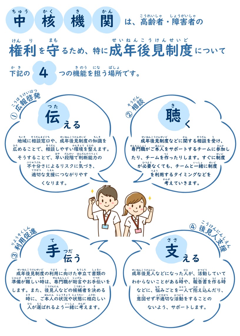 認知症や障害のある方々が、「成年後見制度」など適切なタイミングで権利や財産を守る制度につながるようサポートする機関です。