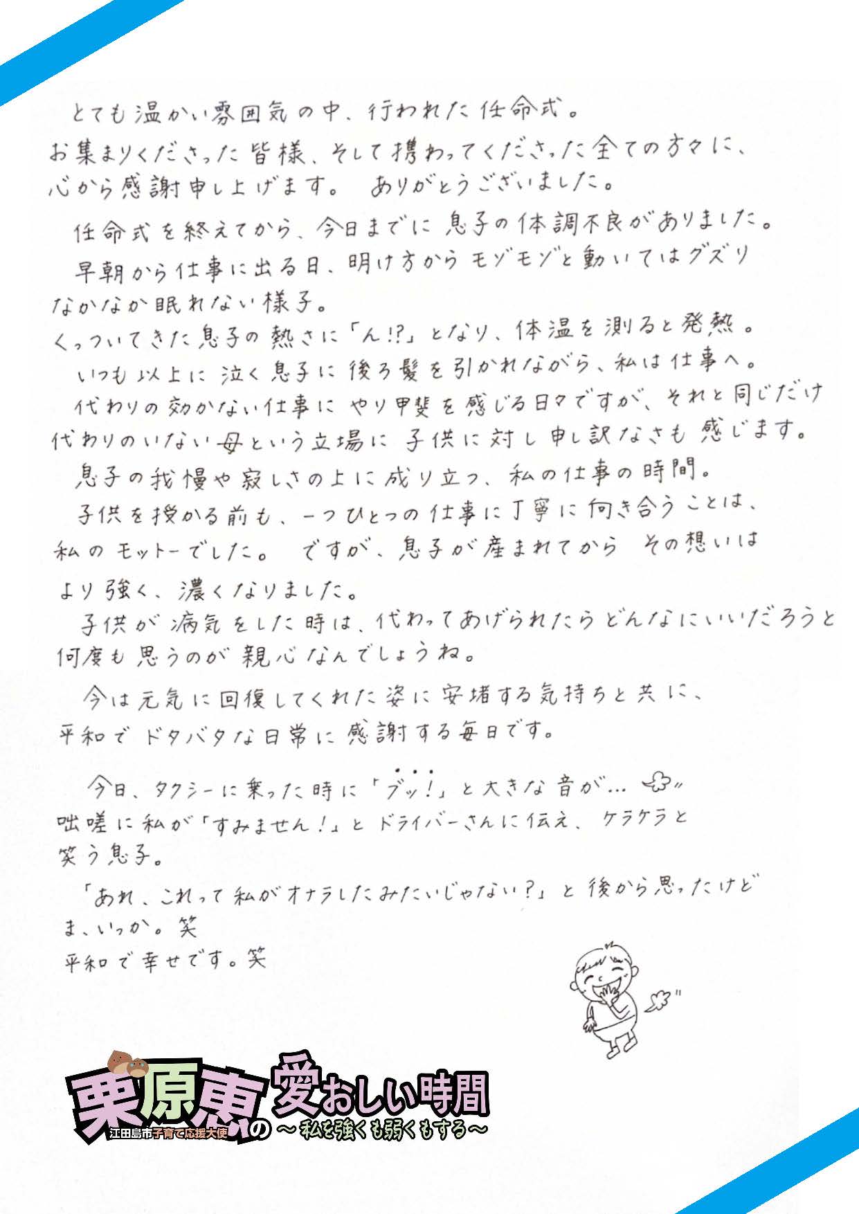 任命式を終えてから、今日までに息子の体調不良がありました。早朝から仕事に出る日、明け方からモゾモゾと動いてはグズりなかなか眠れない様子。くっついてきた息子の熱さに「ん!?」となり、体温を測ると発熱。いつも以上に泣く息子に後ろ髪を引かれながら、私は仕事へ。代わりの効かない仕事にやり甲斐を感じる日々ですが、それと同じだけ代わりのいない母という立場に子供に対し申し訳なさも感じます。息子の我慢や寂しさの上に成り立つ、私の仕事の時間。子供を授かる前も、一つひとつの仕事に丁寧に向き合うことは、私のモットーでした。ですが、息子が産まれてからその想いはより強く、濃くなりました。子供が病気をした時は、代わってあげられたらどんなにいいだろうと何度も思うのが親心なんでしょうね。