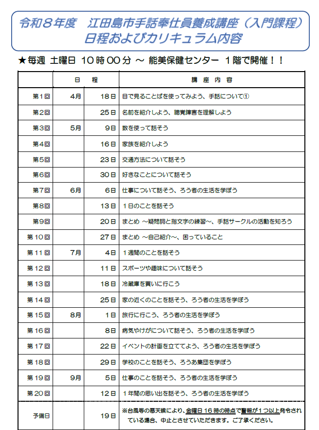 日時 令和8年4月18日㈯~令和8年9月12日㈯※毎週土曜日開催
