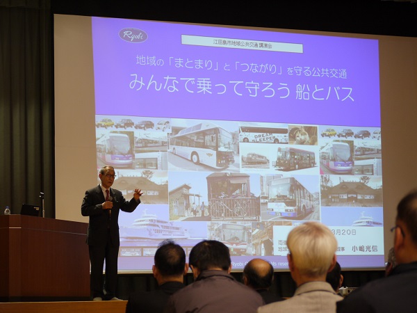 3月20日㈰,江田島市農村環境改善センター(能美町鹿川)多目的ホールで,「~地域の『まとまり』と『つながり』を守る公共交通~みんなで乗って守ろう船とバス」をテーマに地域公共交通講演会を開催しました。三毛猫「たま駅長」やユニークな電車を生み出すなど,「地方公共交通の再生請負人」と呼ばれている小嶋光信さん(一般財団法人地域公共交通総合研究所代表理事)を講師にお招きし,ご自身の経験をお話しいただきました。