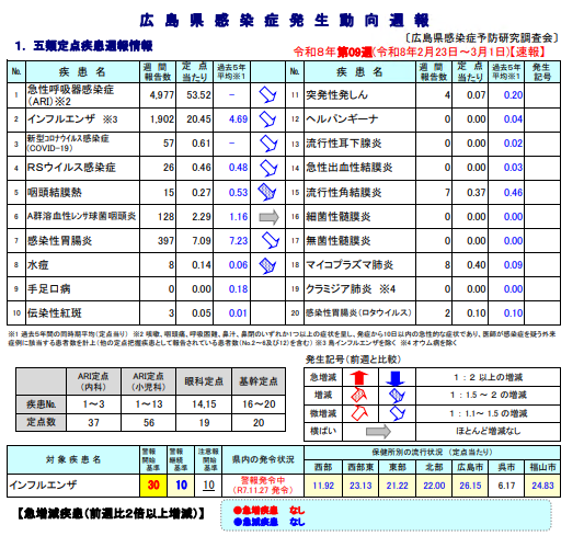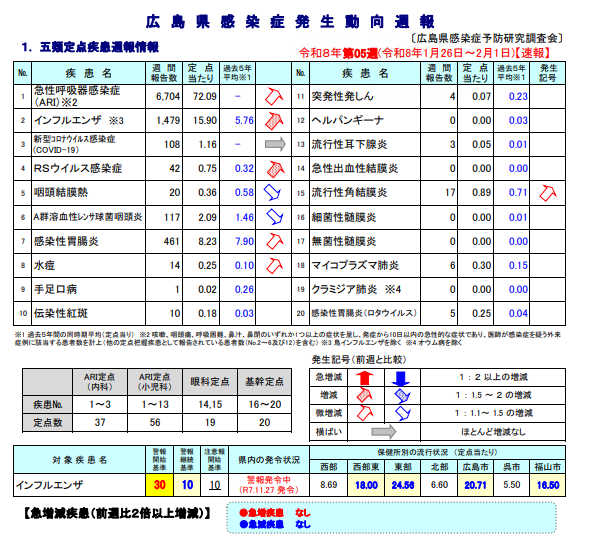 発令基準は、広島県の「感染症発生動向調査警報・注意報発令要領」で定められています。詳しくは以下の広島県のHPをご覧ください。
