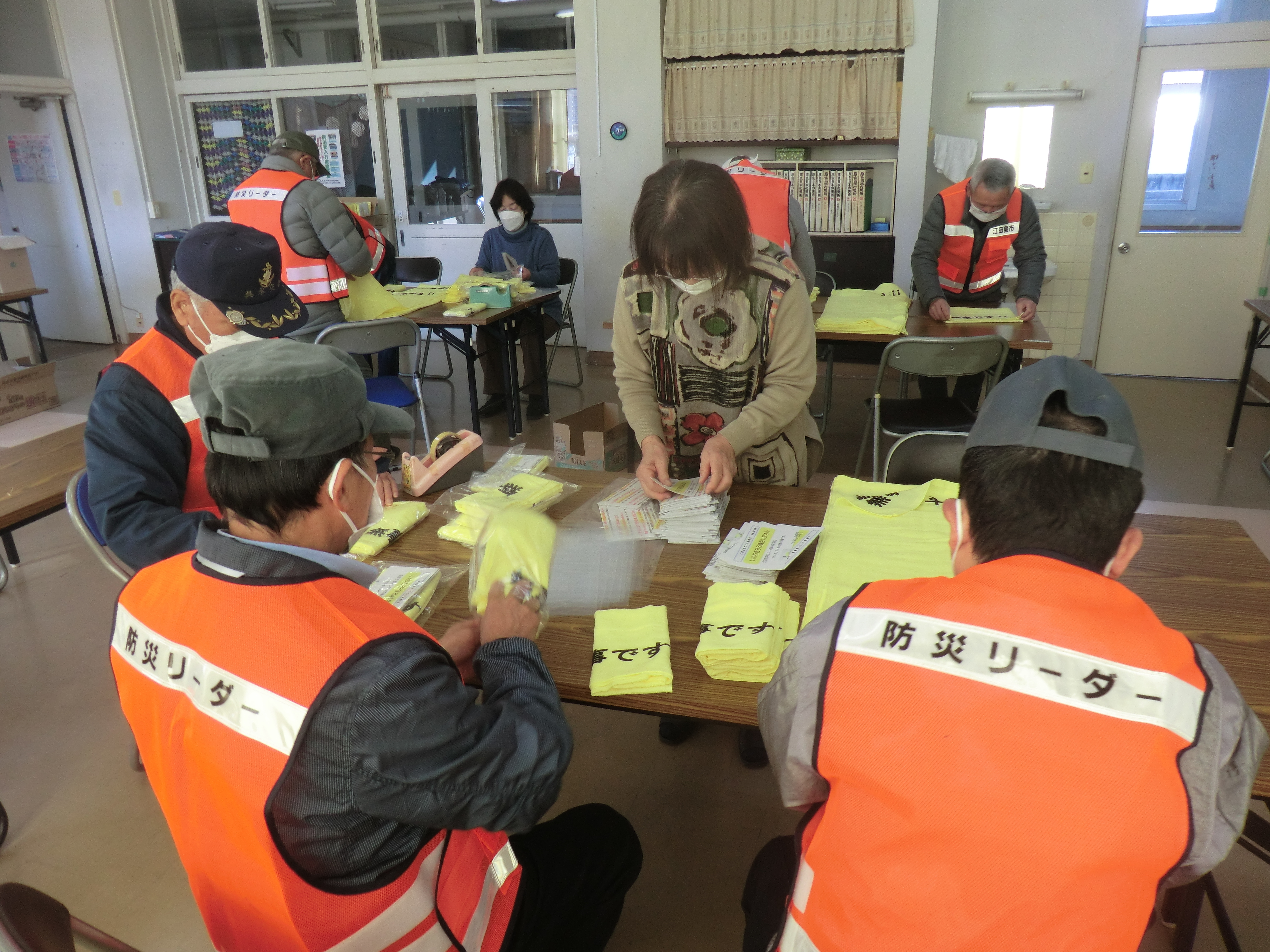 「災害から身を守る ~土砂・地震・津波~」 大又自主防災会は,地域の各世帯を訪問し,作成したパンフレット等を全戸に配布して防災啓発活動を行うとともに,防犯・防火の年末警戒を呼びかけました。災害から身を守るため,「いつ(レベル3・4で)」「どこから(ハザードマップの警戒区域から)」「どこへ(大古小学校体育館又は警戒区域外の親せき・知人宅へ)」避難することを説明したパンフレットや読み物,飲食物の備蓄を推奨するため参考となる保存食などを,地区の全世帯に配布する防災啓発活動を行い,併せて,防犯・防火の年末警戒活動を行いました。 |
