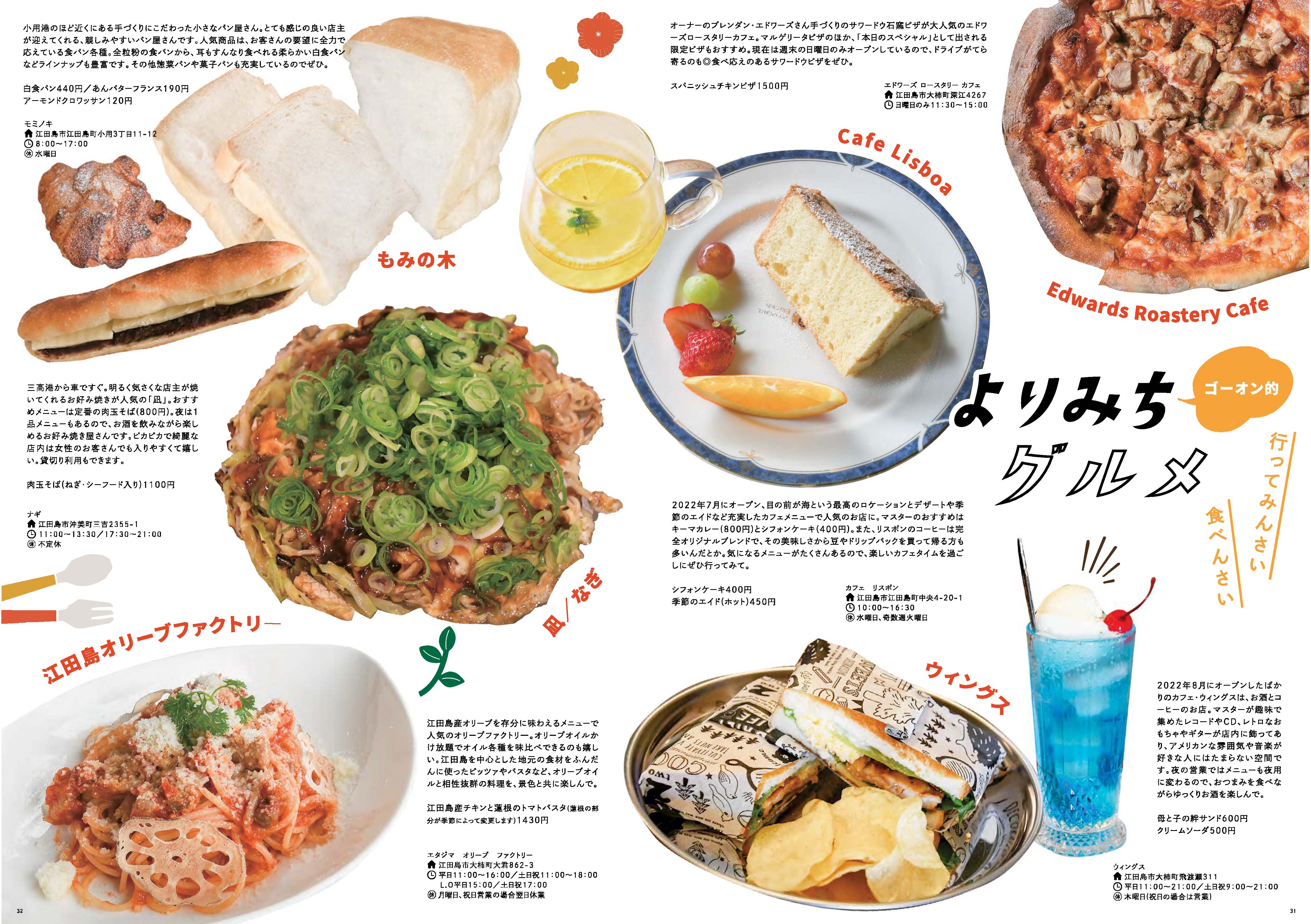 総まとめ編として、広報えたじま掲載分vol.13~23に加え、新たに出会った人たちを撮影した「エタジマで会った人たち」や、おすすめのお店を紹介する「ゴーオン的よりみちグルメ」などの新規頁も追加。
