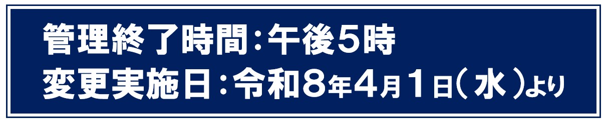 現在、運動公園管理人の管理時間は午後9時までとなっていますが、令和8年4月1日から管理人の管理時間を次のとおり変更させていただきます。