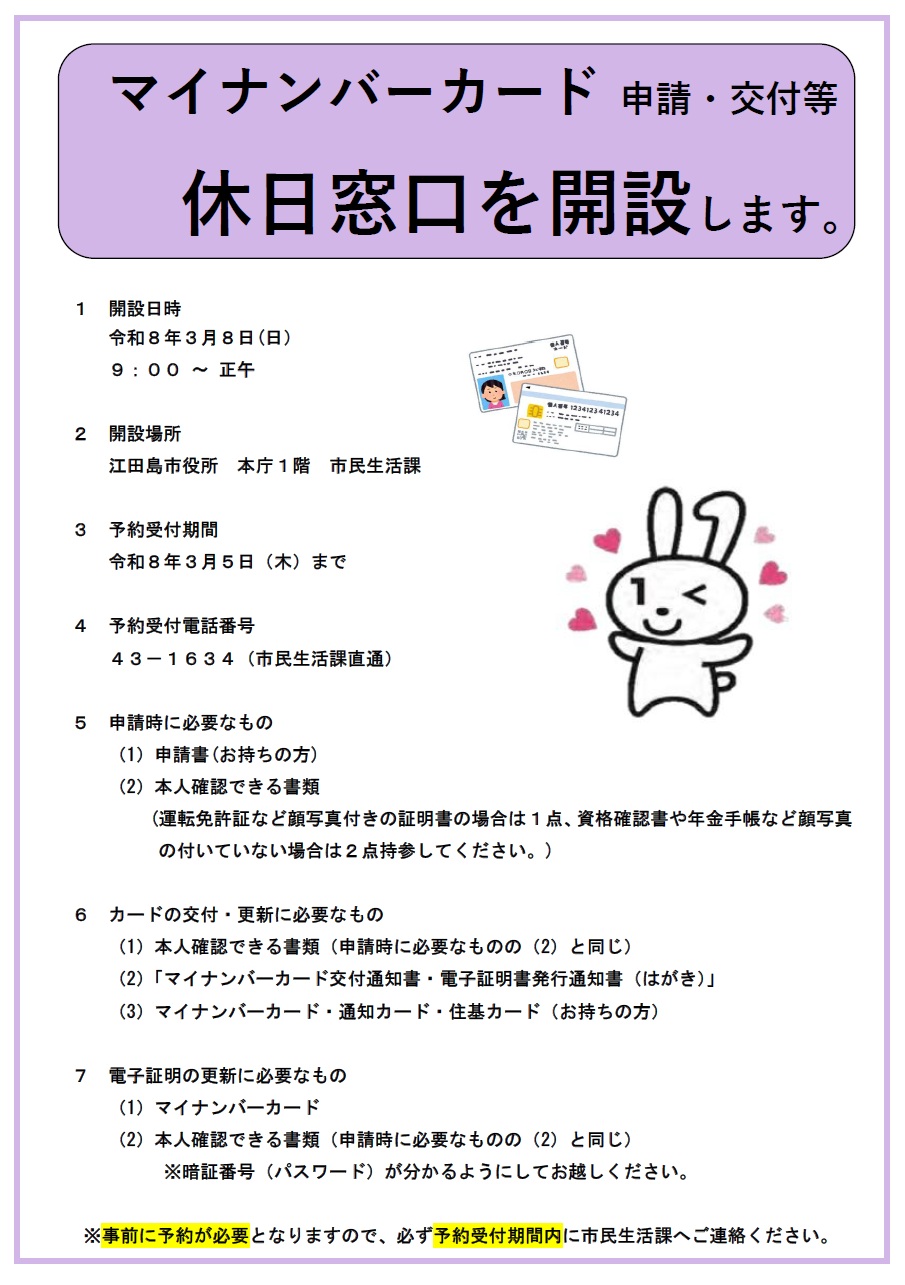 平日にマイナンバーカードの申請や受け取りなどが困難な方を対象に休日窓口を開設します。
