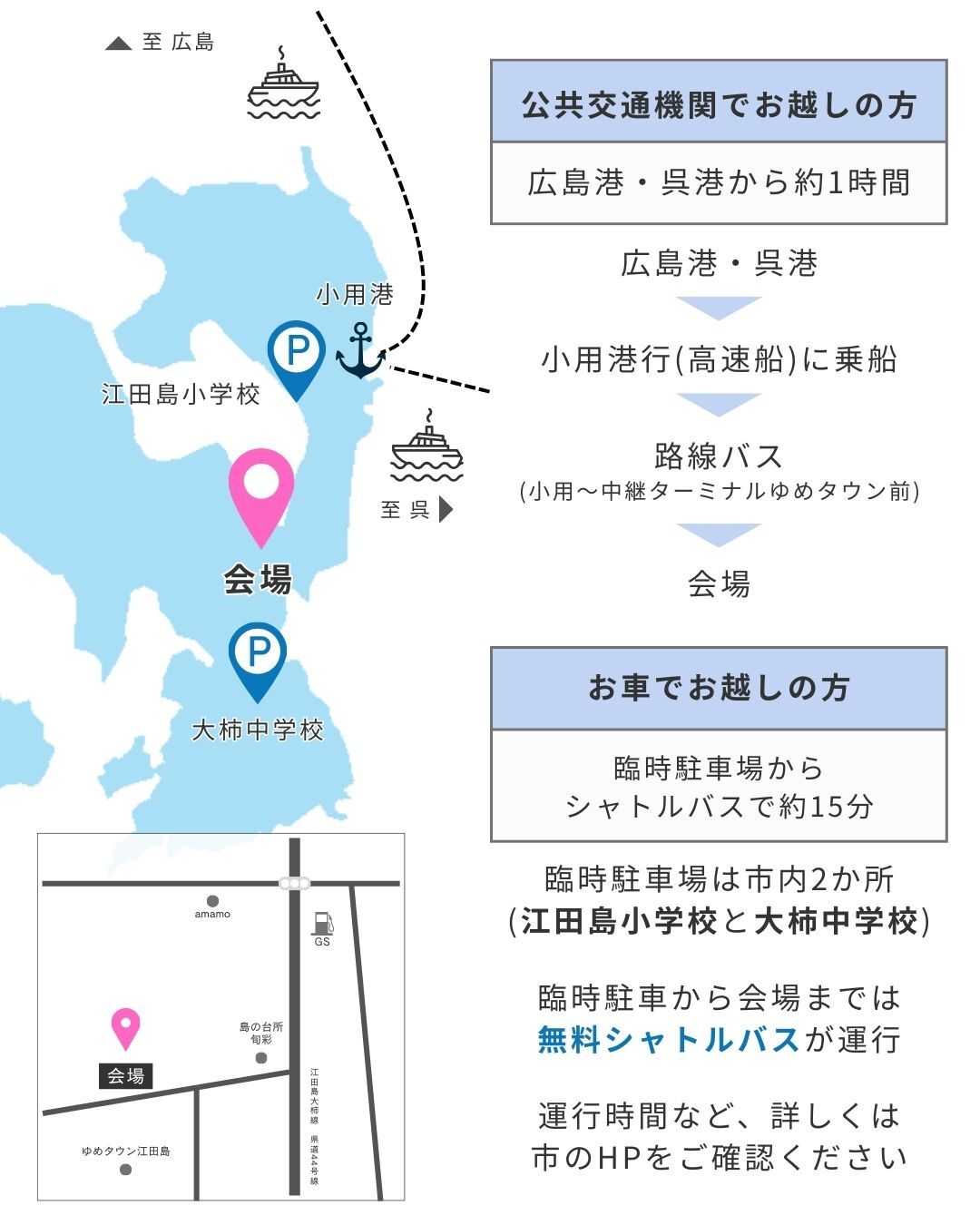 広島港・呉港→小用港行き(高速船)に乗船→路線バス(小用~中継ターミナルゆめタウン前)に乗車→会場