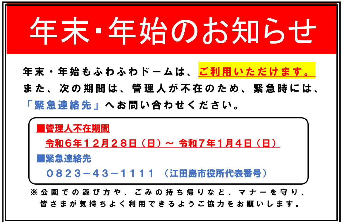 年末・年始も通常どおり、ふわふわドームをご利用いただけます。