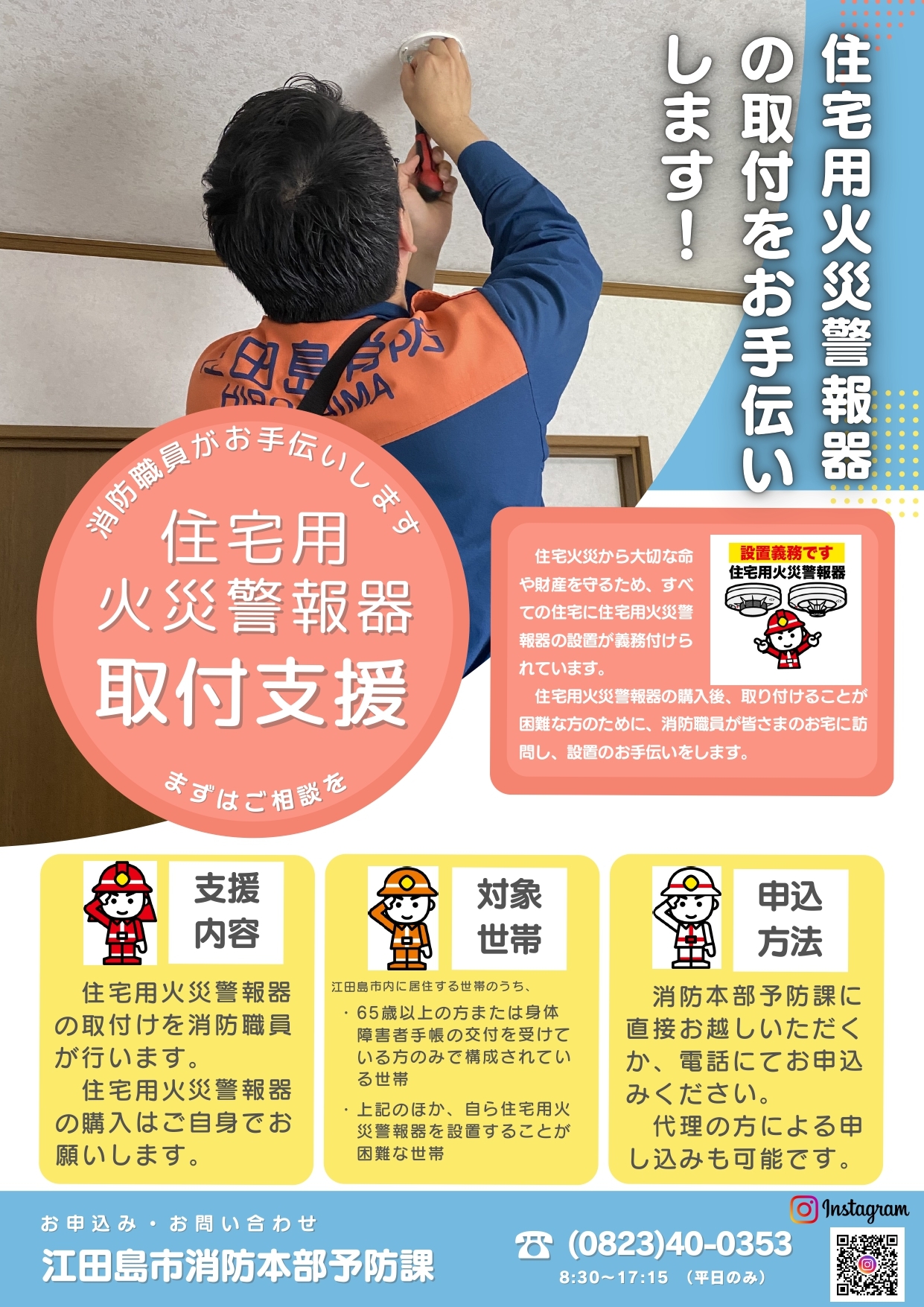 そこで,江田島市消防本部では,住宅用火災警報器を購入したものの,取付けや取替えが困難な高齢の方などを対象として,消防職員が直接,市民の皆様のお宅を訪問し,設置のお手伝いをします。