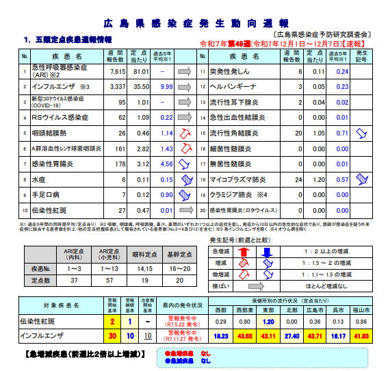 ・インフルエンザ警報(広島県感染症・疾病管理センター)→R7.11.27発令